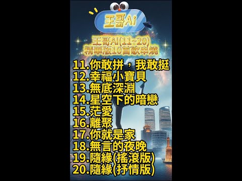 王哥Ai~(精華版10首串燒11~20)11.你敢拼,我敢挺12.幸福小寶貝13.無底深淵14.星空下的暗戀15.茫愛16.離聚17.你就是家18.無言的夜晚19.隨緣(搖滾版)20.隨緣(抒情版)